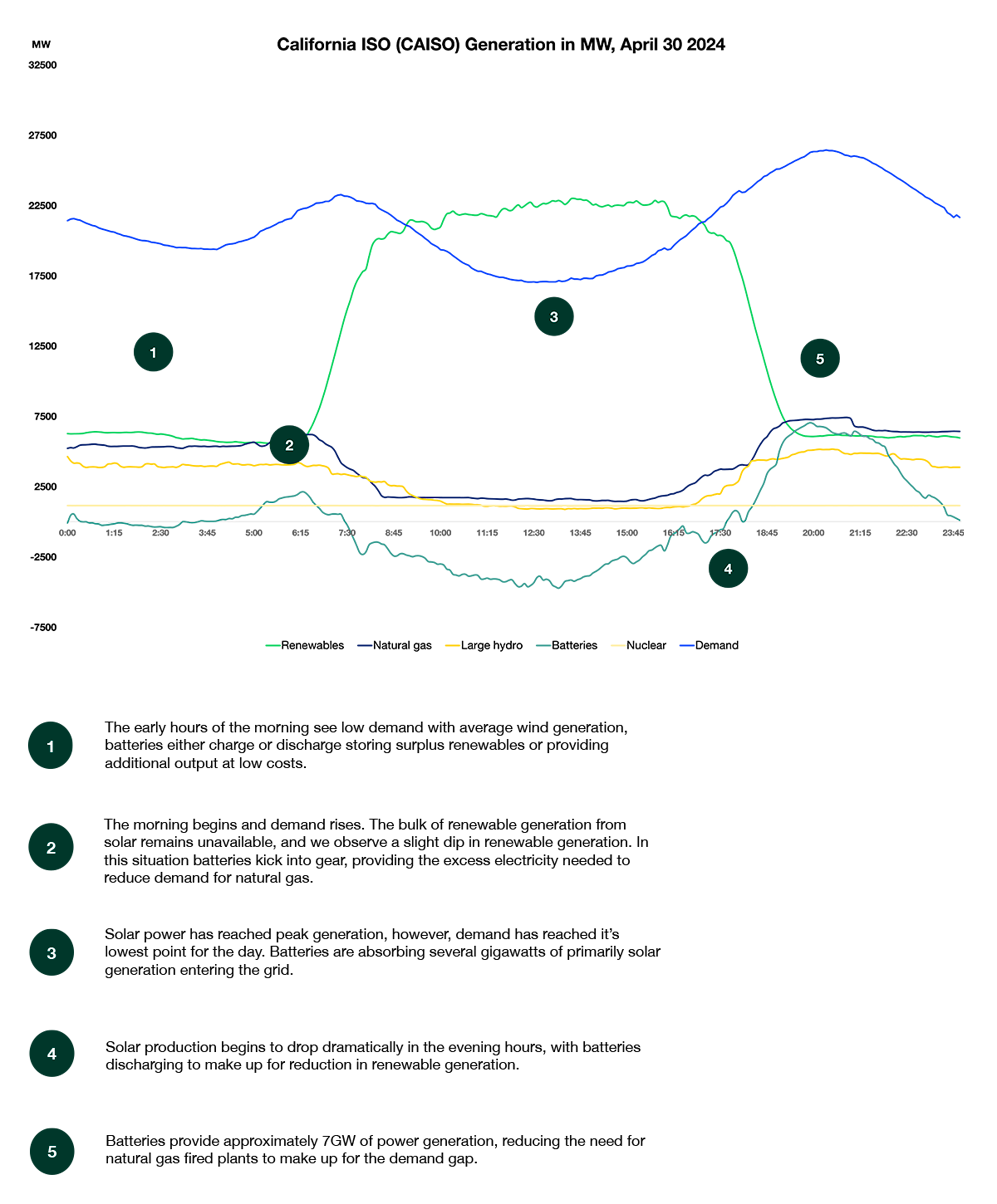 If we look across the Atlantic to sunny California, we can see the potential of flexibility in action. Leading on installed solar with a cumulative capacity exceeding 48GW, California has also taken position as a global leader on the integration of grid-scale batteries in the power grid. From 2018 to 2024, the state expanded battery storage more than twenty-six fold to 13.4GW, and on April 30, 2024, a new record was set, with batteries overtaking both hydropower, nuclear, and renewables as the largest source of supply for a 2-hour period in the evening peak.